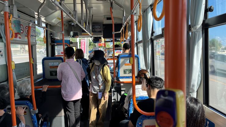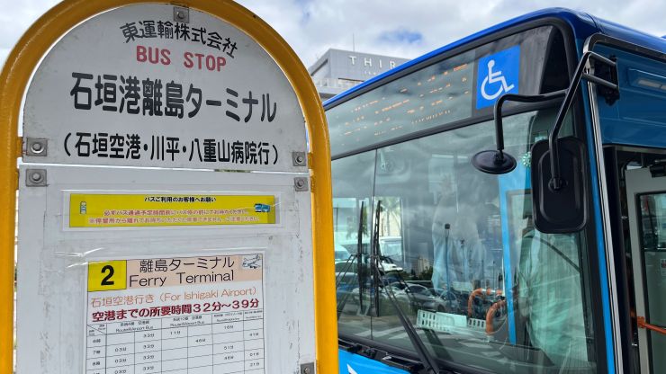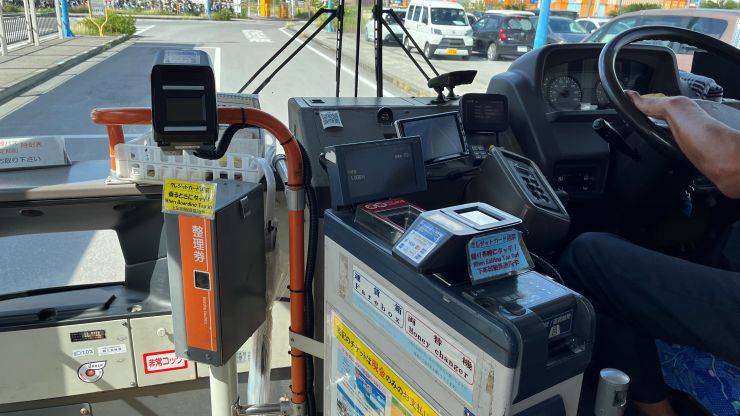 おじさん2人は、バスで市内中心部に繰り出します。^^ レンタカーを借りて島内を回ろうかとも思ったのですが、逆に市街地ではジャマになるのでバスの方が便利。はじめての石垣島で右も左も分からず、郊外を回るほどではないので、今回はパス(バス)としました。 クレジットカードのタップで乗り降り出来るのは便利。 ただ、乗るときと降りるときでタップの場所が違うので、はじめてだと分かりにくいかも。 ↓