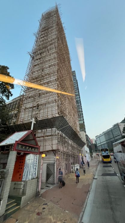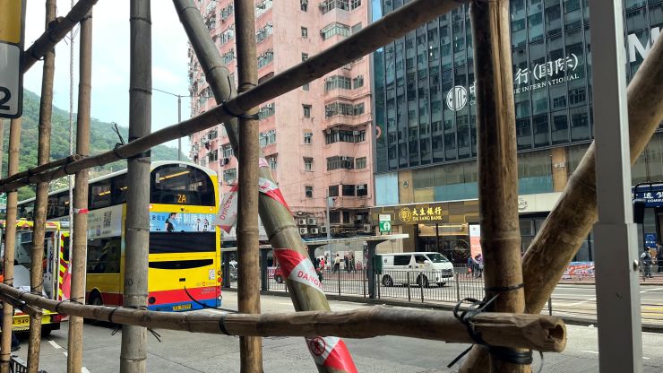 いつものように、ダブルデッカーのアッパーデッキ最前席を確保しました。 改修工事中の、この高層マンションも防護ネットが取り払われました。竹製の足場はむき出し。 危ないったらありゃしない。 ↓