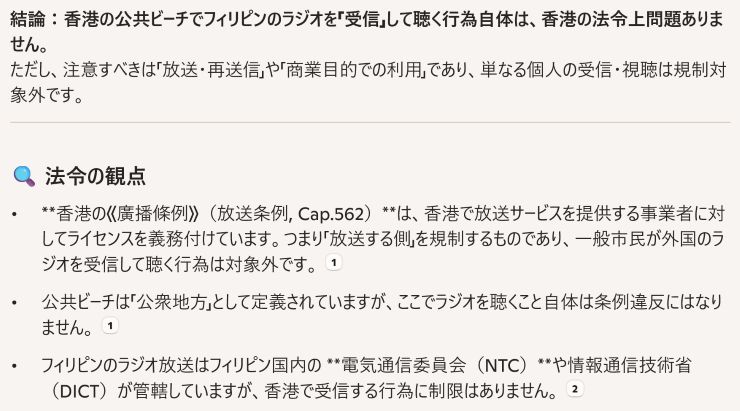 今日は、いつもの食料品買出しをスキップ。そのまま直帰しました。^^ 昨夜から今朝にかけての受信より。^^ Bombo Radyo Tuguegarao(DZGR)@ 891kHz ▽ DZGR-Tuguegarao City (7:04) 891kHz 12/6/25 04:45〜(JST)お祈り・開始アナウンス・国歌・Bombo Radyo コーポレートソング RMN Naga(DWNX)@ 1296kHz 終了と開始部分。フェーディングの谷に追い込まれて一時行方不明とかありながらも、まぁ、中波なんてそんなもんだ。(笑) ↓ ▽ DWNX-Naga City (3:31) 1296kHz 12/6/25 00:56〜(JST)お祈り・終了アナウンス・国歌 ▽ DWNX-Naga City (5:38) 1296kHz 12/6/25 04:55〜(JST)国歌・お祈り・開始アナウンス・Canned ID/SJ ということで、夕方から、10/25以来となる日帰りペディに出かけました。 単身生活なので何をするのも自由でナイス!です。^o^ 以前も書いた通り、重い腰を上げて日帰りペディに出るためには @ 翌日が休日であること(さすがに翌日が仕事はキツイ!) A 確実に雨が降らないこと B 暑すぎないこと、寒すぎないこと C 風が強くないこと D モチベーションが維持されていること - という各要素をすべて満たす必要があります。 前回の日帰りペディのあとすぐ石垣島ペディがあり、その受信ファイル解析で先週末まで時間を費やすこととなりました。ようやくこれが一段落したこと、再来週は日本から奥方が来ること、その後は日本に一時帰国で本日は年内のラストチャンスとなること、加えて上記ABCの各条件も揃い、ここまで来たらもう行くしかないよね、という感じ。(笑) 奥方からは、「どうでもいいけど捕まらないでよ 〜 」と念を押されます。 そんなこと言われたって困るのですが ^^;; AI はこう仰っています。 ↓