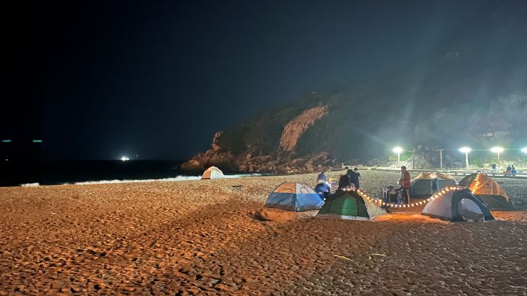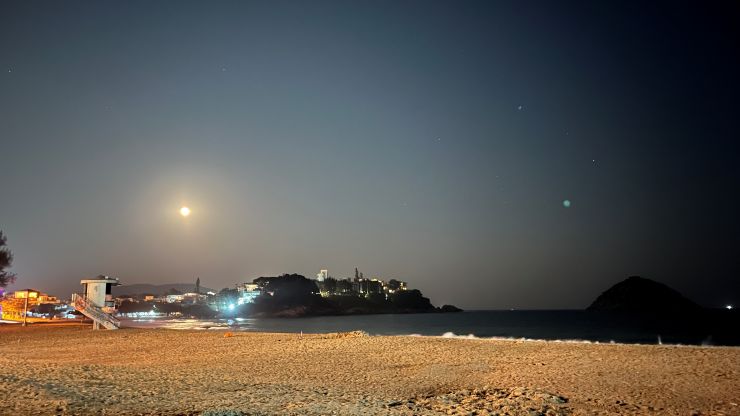 向こう側の灯りは、何やらバーベキュー・レストランみたい。 照明が多少ノイスを出すことはある?かも知れないけど、一方、このお陰でビーチが完全に真っ暗闇というシチュエーションにはならず、なかなかいい。 ↓