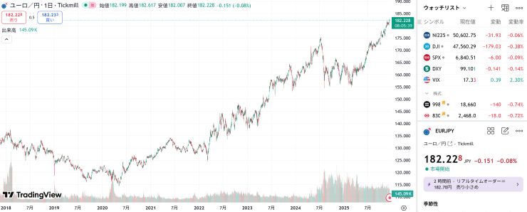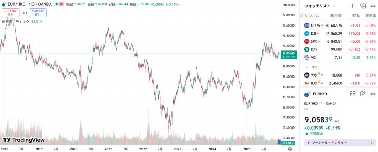 一方、米ドルとペッグしている香港ドルとユーロの比較では、アップダウンありながらも均すとさほど上がっているわけではないみたい。 ↓